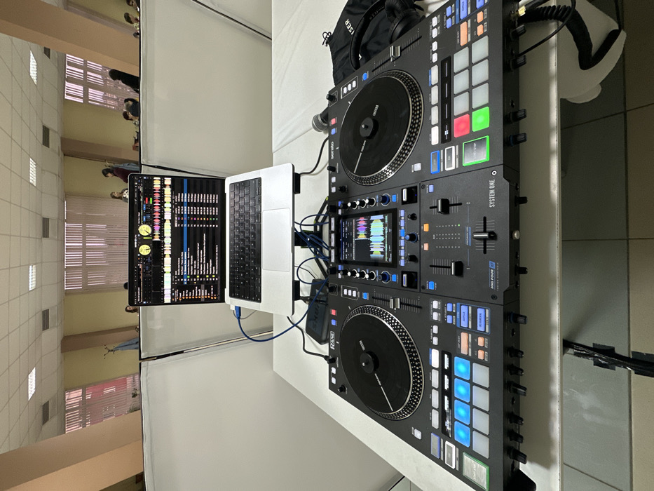 The scene depicts an indoor event setup within the city of Dve Mogili, Bulgaria. In the foreground, a black Rane System One DJ controller is positioned on a white table. A silver Apple MacBook Pro laptop, elevated on a black stand, sits behind the controller, its screen displaying Serato DJ Pro software with waveforms and track lists. Blue and black cables connect the laptop to the controller and a small black Shure box located near the laptop stand. To the right of the controller, a silver microphone rests horizontally, accompanied by black over-ear headphones and a black drawstring bag. Behind the DJ equipment, white opaque partitions partially obscure the background. The background reveals a large room with beige walls, a tiled ceiling, and multiple windows equipped with vertical blinds. Recessed fluorescent light fixtures are visible in the ceiling. Several individuals are present in the background, standing and seated beyond the partitions, indicating an active social or event environment.