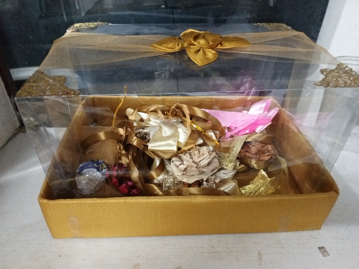 A golden gift box with a clear plastic lid sits on a surface. The lid is decorated with a golden bow and ornate golden corner accents. Inside, various items are arranged: several chocolates wrapped in colorful paper, ribbons in shades of gold and pink, and small, decorative fabric flowers. The box itself is lined with golden fabric, and the overall presentation suggests a thoughtful and elegant gift arrangement.