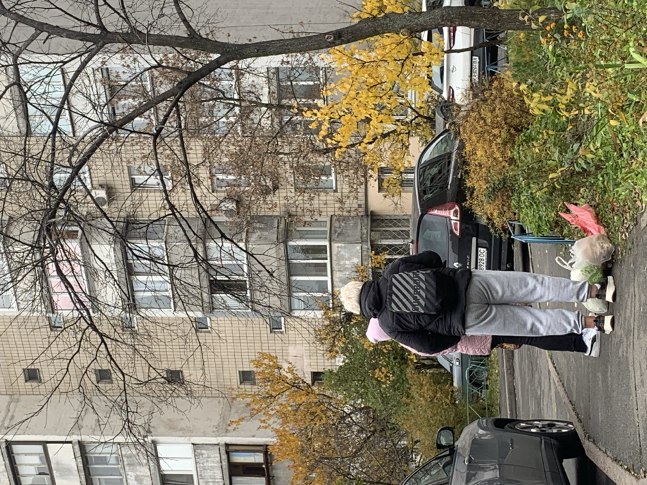 The image displays an urban residential scene in Kyiv, Ukraine, consistent with an autumn setting due to visible yellow foliage and bare tree branches. Two individuals are central to the foreground, viewed from behind, standing on a concrete sidewalk. The person on the right has light blonde or white hair, wears a black puffer jacket with a reflective "SUPERDRY" backpack featuring diagonal white stripes, grey sweatpants, and dark sneakers with white soles. To their immediate left, a second person is partially visible, wearing a pink or light-colored jacket and dark pants. On the ground beside the individuals, multiple plastic bags are present: a translucent green bag, a white bag, and a red bag, all appearing to contain groceries or other items. To the left, the rear section of a grey SUV is partially visible. Behind the people, a paved street runs parallel to the sidewalk, with a black Renault hatchback parked directly opposite, displaying Ukrainian license plate 8928 OC, which designates Kyiv City. Further right, a white SUV with license plate KA484 BA is partially visible. The background is dominated by a multi-story residential building, characterized by a light beige or off-white facade with a tiled or textured pattern. The building features numerous windows and several balconies, some enclosed. Air conditioning units are mounted on the exterior walls. Deciduous trees, some with their branches completely bare and others exhibiting vibrant yellow leaves, are situated between the street and the building. The sky is overcast, providing diffuse lighting for the scene.