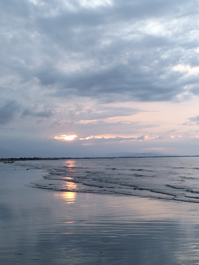 The image depicts a coastal scene in Curehtunong, Indonesia, observed during either sunrise or sunset. The sky, occupying the upper two-thirds of the frame, is predominantly covered by dense, stratified clouds ranging from dark grey to light grey, with a horizontal band of soft pinkish-orange hues visible near the horizon. The sun's light emanates as a bright golden-orange glow from a break in the clouds, positioned slightly left of the central horizon. This light reflects prominently on the water's surface, creating a shimmering golden-orange path extending towards the foreground. The water, likely a sea or ocean, exhibits gentle waves breaking onto a wet, dark sand beach that occupies the lower-left and bottom portion of the image. The sand is smooth and reflective. A small, light-colored boat is partially visible on the far-left shoreline. A faint, dark landmass, possibly distant hills or mountains, is discernible along the horizon line, with some indistinct structures visible on its left side. No individuals are present in the scene.