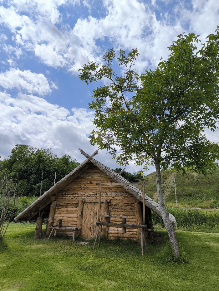 A small, rustic wooden house with a thatched roof sits amidst lush greenery. The house features a simple, rectangular structure with a door and wooden benches nearby. A tree partially obscures the view of the house, its leaves a vibrant green against the backdrop of a partly cloudy sky. The scene exudes a tranquil and historical charm.