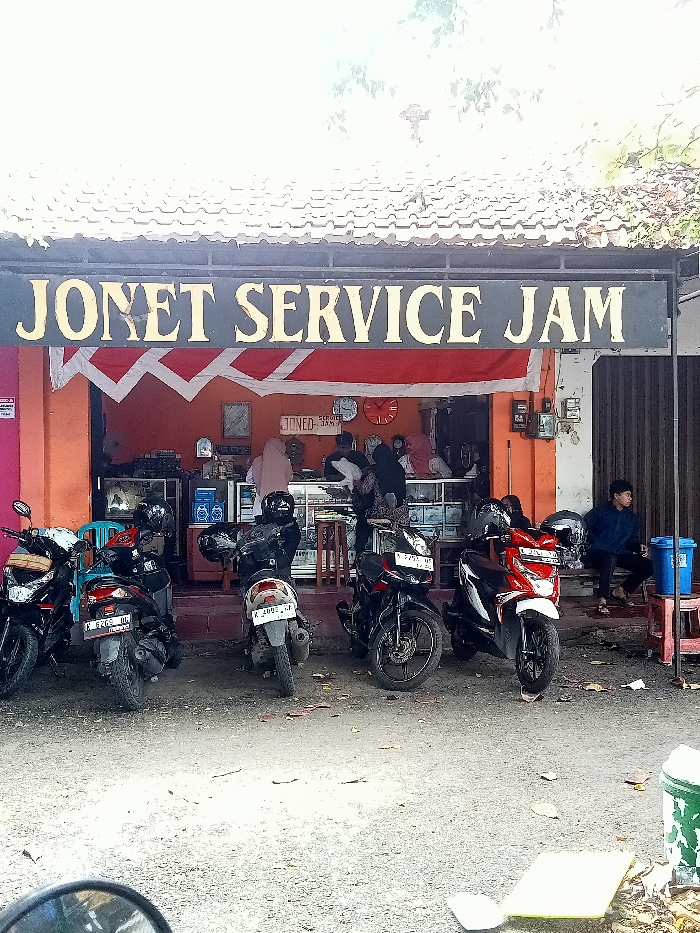 A shot of a building with the words "Jonet Service Jam" written on the sign above the door. Several motorbikes are parked in front of the building, and a man is sitting on a stool near the entrance. Several people are visible inside the building, likely customers. The building has an orange façade, and there's a red and white zig-zag banner above the entrance. The background includes a tiled roof and some trees.
