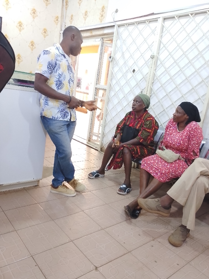 The image depicts an indoor scene with four individuals, three of whom are clearly visible. A male subject, standing on the left, wears a white short-sleeved shirt with blue and yellow floral patterns, blue jeans, and tan sneakers. He faces right, with both hands raised and open, palms up, appearing to be speaking or explaining something. To his right, two female subjects are seated, facing left and observing the standing male. The first female, seated on the left, wears a red, green, and black patterned long-sleeved dress, a green head covering, and black and white slides. A black bag rests on her lap. The second female, seated on the right, wears a red and white patterned dress, a black head covering, and black and white slides with a Nike logo. A light-colored woven handbag is on her lap. Partially visible in the bottom right corner are the lower legs and feet of a fourth individual, wearing light tan pants and tan slip-on shoes. The setting features a light brown tiled floor with a repeating square pattern. The wall behind the standing male has a gold-on-white patterned wallpaper. A white cabinet or counter is positioned to the immediate left of the standing male. Behind the seated women, a white metal security gate with a diagonal grid pattern is partially open, revealing a doorway or hallway with natural light beyond. An overhead light fixture is visible above the security gate. The specific location within Shaba, Nigeria, is not discernible from the image.
