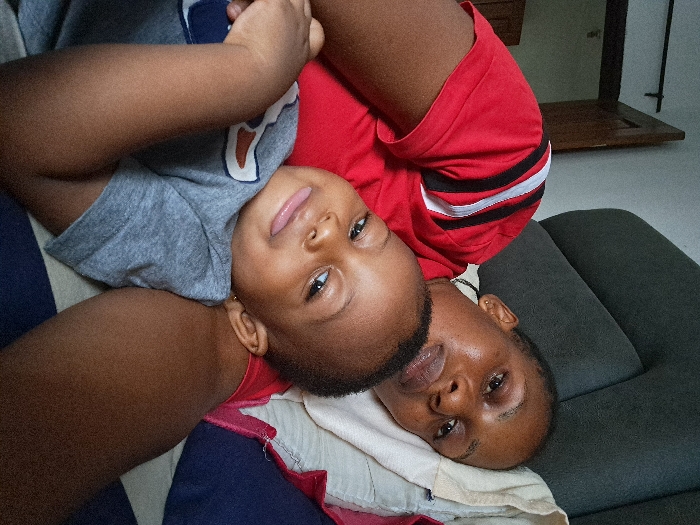An image taken indoors depicts two individuals, an adult female and a young child, positioned closely together. The adult female, with a dark complexion and short dark hair, lies on her back, her head slightly tilted, gazing towards the camera. She is wearing a red short-sleeved t-shirt with white and black horizontal stripes on the upper sleeve. A small gold stud is visible in her right earlobe. The child, also with a dark complexion and short dark hair, lies adjacent to the adult's left side, with their head resting near the adult's shoulder. The child, estimated to be a toddler, wears a grey short-sleeved t-shirt with a partial white and orange graphic design. The child's tongue is slightly extended, and their eyes are directed towards the camera, conveying a playful expression. A small gold stud is visible in the child's right earlobe. Both individuals are situated on a surface covered by bedding or upholstery; a light-colored pillow is visible behind the adult's head, and a multi-colored striped fabric (blue, red, beige) is partially visible beneath the child. A dark grey upholstered surface, possibly a headboard or sofa backrest, is behind the adult. In the upper left background, a partially open wooden door and doorframe are visible, indicating an interior room. The location is Unknown, Unknown.