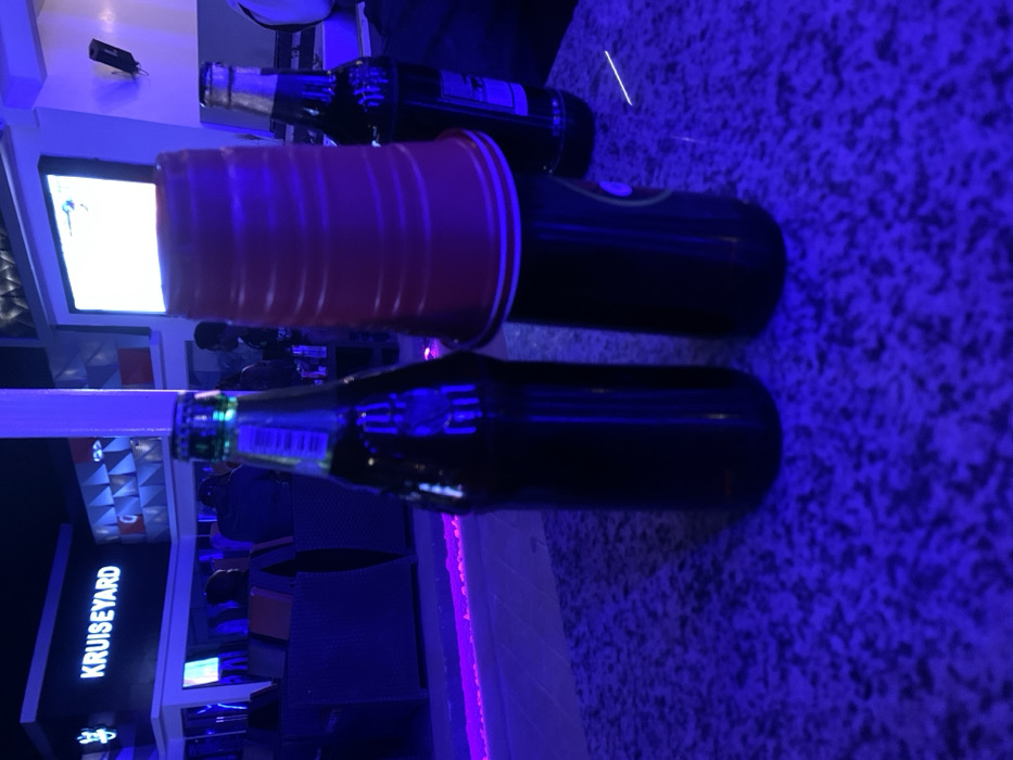 A rotated image shows three dark-colored beer bottles. A red plastic cup rests on one bottle. The bottles and cup are on a speckled surface under blue lighting. In the background, a sign for "KRUISEYARD" is visible, along with a TV screen and outdoor seating. The overall scene appears to be at a bar or outdoor entertainment area.