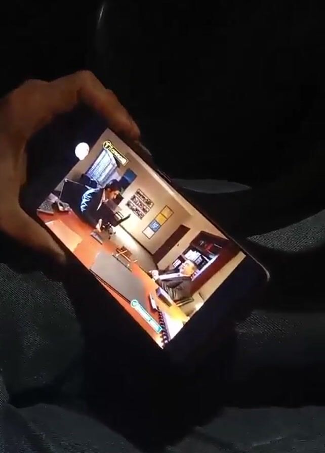 person in a car holding a phone, which displays a scene from a game or animation of a man standing in an office, looking at another man seated at a desk