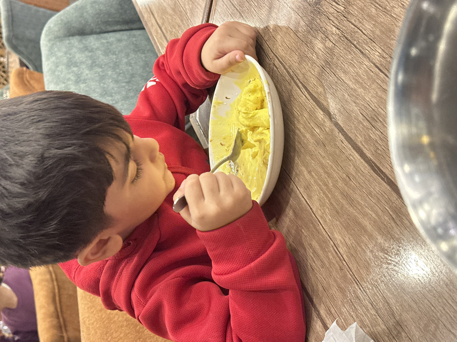 A young child with dark hair, wearing a red sweater, is seated at a wooden table. They are holding a white oval dish filled with yellow food, possibly scrambled eggs or a similar dish. The child is using a spoon to eat. A light blue chair is visible in the background, and a partially visible silver pot is on the table as well. The scene appears to be indoors during daytime.