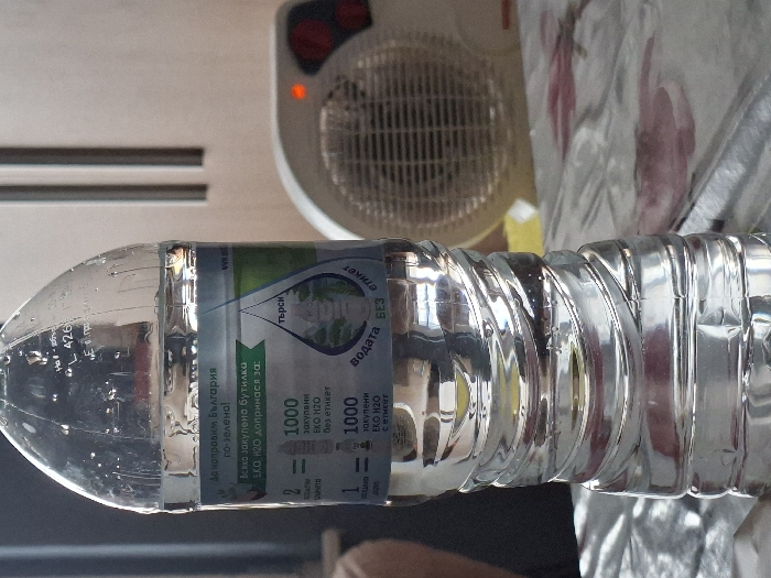 A clear plastic water bottle, approximately two-thirds full and exhibiting external condensation, is positioned centrally in the foreground. The bottle features a blue and green label with Bulgarian text, including phrases such as "Да направим България по-зелена!" (Let's make Bulgaria greener!) and "ВОДАТА БЕЗ ЕТИКЕТ" (WATER WITHOUT LABEL), promoting an environmental initiative. The bottle rests on a light-colored surface covered by a patterned tablecloth, displaying faint floral or abstract motifs. In the background, to the right of the bottle, an off-white electric fan heater with a circular grill is visible, displaying an illuminated orange indicator light. Behind the heater, a light-toned wall or cabinet with two distinct vertical silver handles is discernible. The scene is an indoor environment. The specific location within the city of Selyanin, Bulgaria, is not discernible from the provided image data.