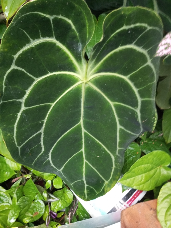 A large, dark green Anthurium leaf dominates the frame. The leaf exhibits prominent, contrasting light-colored veins, creating a striking pattern. Surrounding the Anthurium are smaller, vibrant green leaves from other plants, adding depth and texture to the composition. A hint of a white container is visible beneath the foliage, suggesting a potted arrangement.