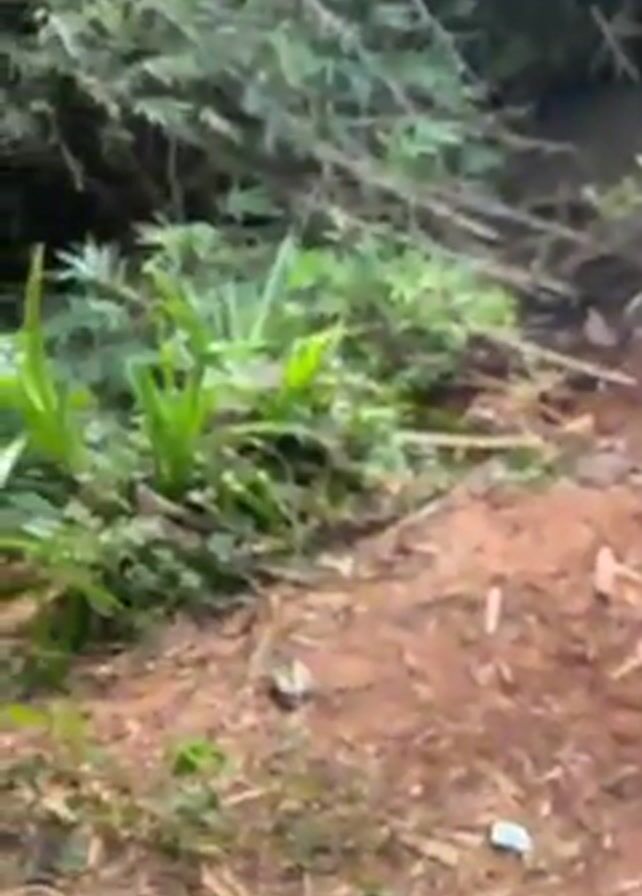 The video begins with a shot of a small, murky river flowing through a wooded area
