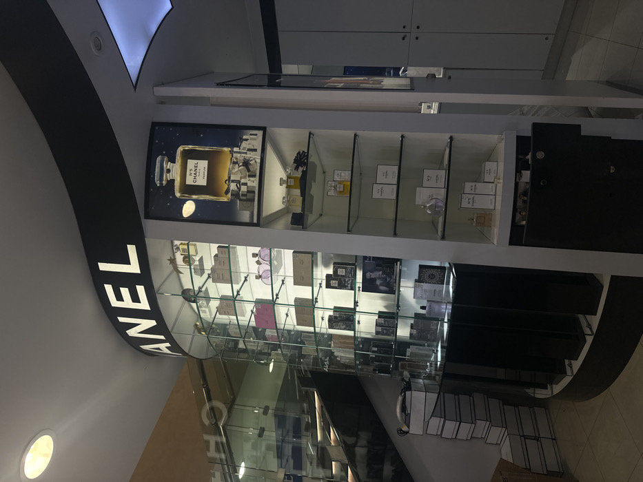 A rotating Chanel display features a large illuminated Chanel logo. Shelves showcase an array of Chanel perfumes and beauty products behind glass. A promotional image of Chanel No. 5 adorns the top shelf. Additional branding elements and product packaging are visible below, contributing to a luxurious and branded presentation.