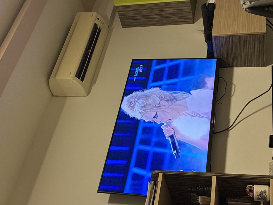 The image displays an indoor residential setting, likely in Bulgaria, indicated by the "NOVA" television channel logo. A large, wall-mounted flat-screen television is centered in the frame, displaying a live performance. On the television screen, a blonde female performer with dramatic dark eye makeup and an elaborate hairstyle is visible in profile, singing into a silver microphone. The time "20:18" is also visible on the TV screen. Above the television, a beige-colored Daikin brand wall-mounted air conditioning unit is installed. To the left of the television, a light-colored wooden open-shelf unit is partially visible, containing books, a dark bottle, and a white ceramic mug with a blue design. To the right, a multi-toned wooden wall-mounted cabinet or shelf unit is partially visible. Black electrical cables are seen extending downwards from the bottom edge of the television. The walls are a plain light color. While the "NOVA" channel confirms a Bulgarian context, the image lacks specific visual identifiers such as street signs, unique landmarks, or distinctive architectural details to determine a precise location within the city of Burgas, Bulgaria.