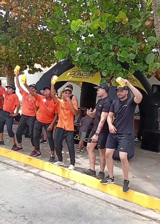 A group of seven people in orange shirts and black pants/shorts are standing on the sidewalk and in the street. The people in orange are holding yellow cups in the air and dancing and waving them to the music. Two other people in black shorts and shirts are also dancing to the music. They are standing in front of a large, black-and-yellow sign that says “DUNCEN, Innovation in Movement.” Behind the people, there is a green tree. The scene takes place outside in the daytime.