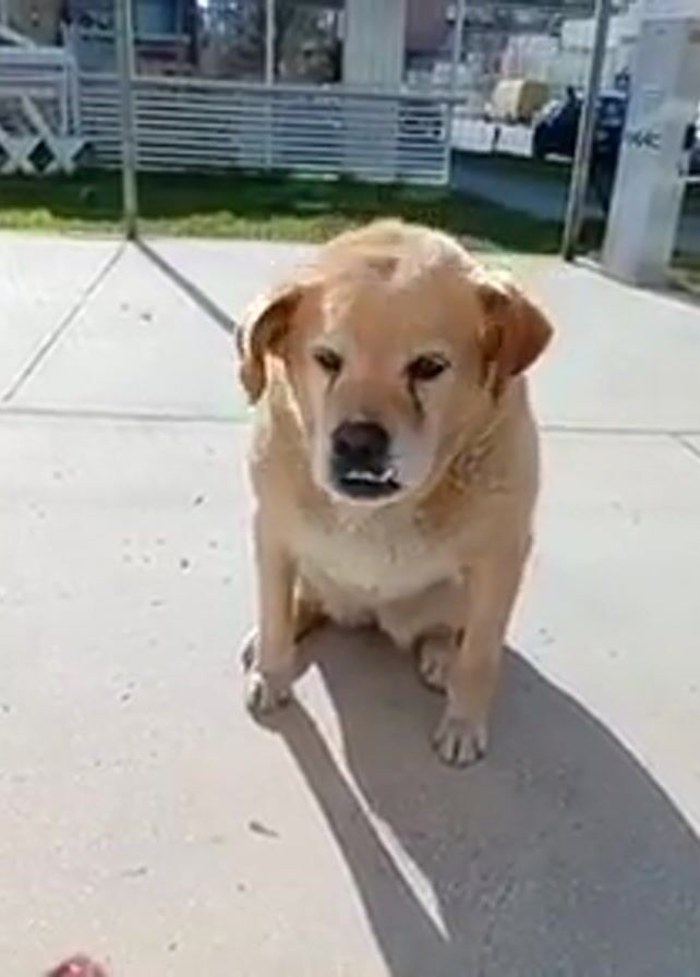 A tan mixed-breed dog sits on a light-colored concrete surface on a sunny day