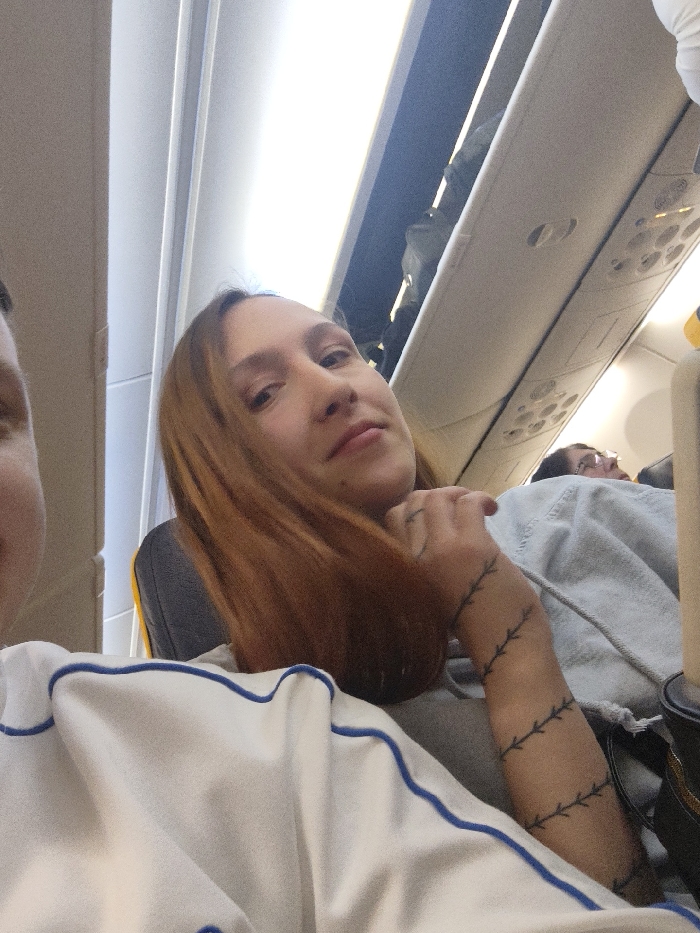 The image depicts the interior of a commercial airplane cabin, likely associated with air travel to or from Sofia, Bulgaria. A young adult female with reddish-brown hair is seated in the mid-ground, looking directly at the camera. Her left forearm is visible, displaying a continuous black line tattoo design resembling barbed wire or a thorny vine. She is wearing a grey top. To the left, a portion of a second individual, likely the photographer, is visible, wearing a white garment with blue piping. In the background, a third individual is partially visible, appearing to rest, wearing glasses and covered with a light-colored blanket or garment. The cabin environment includes beige overhead bins, recessed ceiling lights, and dark-colored airplane seats with yellow accents.