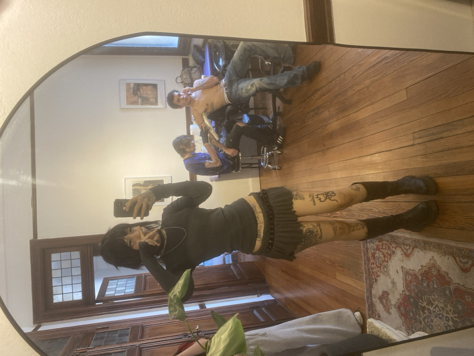 A person stands in front of a large oval mirror, holding a phone and taking a selfie. They wear a black top, mini skirt, and knee-high boots, displaying prominent tattoos on their arms and legs. In the mirror's reflection, a shirtless individual sits getting a tattoo by another person seated on a rolling chair. The room contains wooden floors, a rug, artwork on the walls, and a windowed door, suggesting an interior space.