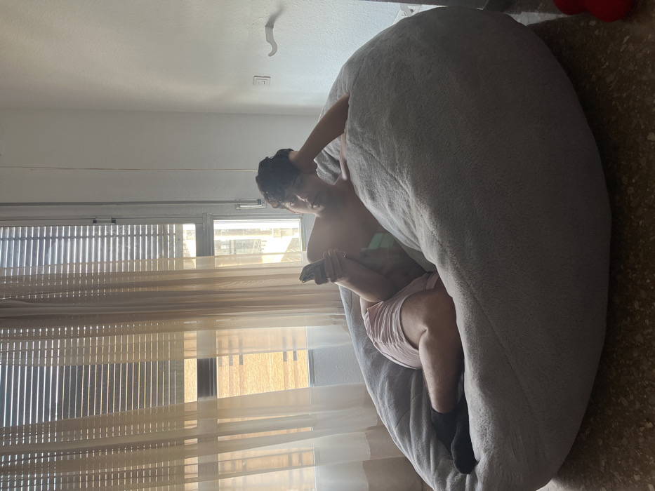 An individual is depicted reclining on a large, light-grey textured beanbag chair within an interior residential space in the city of Valencia, Spain. The specific street or neighborhood is not discernible from visible architectural details. The young adult male subject, with dark curly hair, is partially bare-chested, wearing light pink shorts and dark socks. He props his head with his left hand, elbow resting on the beanbag, while holding a dark-cased smartphone in his right hand. His gaze is directed generally forward. A window on the left side of the frame is fitted with white horizontal blinds, partially open, and covered by translucent light-brown sheer curtains. Through the window, a fragment of an adjacent building with a reddish-brown brick facade is visible. The white wall on the right features a white electrical outlet plate and a white S-shaped wall hook. The floor consists of brown and beige speckled terrazzo tiles. A small, obscured red object is present on the floor in the bottom right. Natural light from the window illuminates the scene.