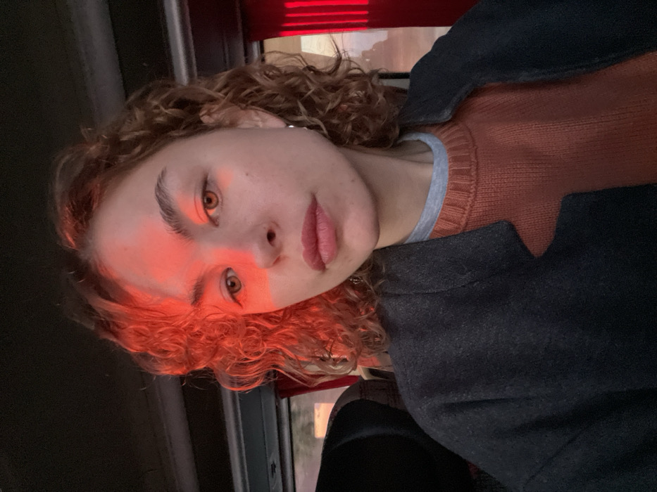 A young adult female is depicted in a close-up, seated inside a vehicle, identified as a bus or coach, in Lapčići, Montenegro. She faces the viewer directly. A prominent red light source, positioned to her left, intensely illuminates the left side of her face and her medium-length, curly reddish-brown hair. This illumination casts a red hue across her nose and cheek, creating distinct shadows. She has light skin, brown eyes, and her lips are naturally pigmented. She wears a small silver hoop earring in her visible left ear. Her attire consists of a dark grey collared jacket, an orange crew-neck sweater, and a light grey t-shirt. The background shows the dark interior ceiling of the vehicle, a window on the left displaying an indistinct exterior environment, and red pleated curtains on the right side, which appear to be either a source or reflector of the red light.