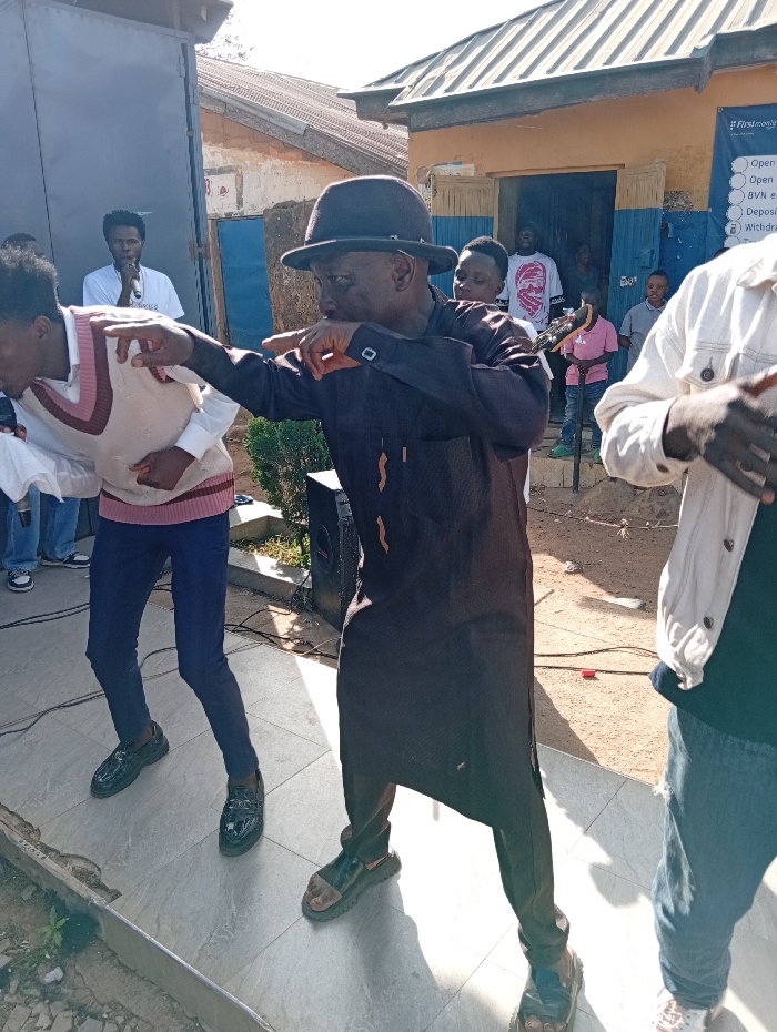 The image depicts an outdoor scene in Jebbu Miango, Nigeria, showing a group of individuals gathered, with several engaged in performance. In the foreground, a man wearing a dark fedora, a dark brown long-sleeved tunic (agbada-style), and dark sandals stands with his right arm extended forward and fingers clasped, indicating a pose or dance move. To his left, another young man, dressed in a white collared shirt, a beige and pinkish V-neck sweater vest, dark trousers, and black loafers, is bent forward with both arms raised, also appearing to dance. Partially visible on the far right, a third individual wears a light-colored jacket and blue jeans, with their hands positioned in a dynamic gesture. In the background, positioned behind the left dancer, a man in a white T-shirt holds a microphone. Multiple other individuals are visible observing from a doorway and around a building with a corrugated metal roof. This building features light brown walls with blue trim around an open doorway, and a partially visible sign on the wall, reading "Firstmo..." with bullet points underneath, likely indicating banking services. To the left of the main performers, a large black speaker box is present. The foreground ground surface consists of light-colored tiles, beyond which is a dirt or gravel area with some visible cables. The lighting indicates a bright, sunny daytime environment.