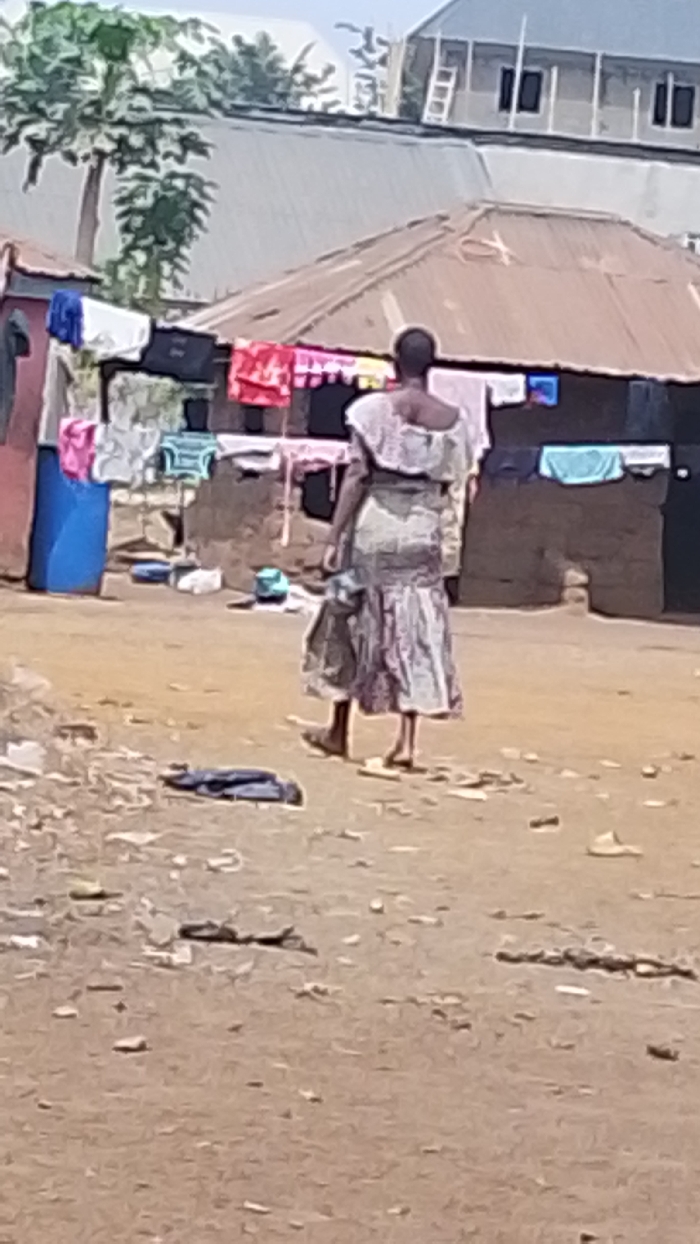 A woman in a patterned dress walks away from the viewer across a dusty, cluttered yard. Laundry hangs on lines between crude structures with corrugated metal roofs. A blue barrel sits near a mud-walled dwelling with open doorways. The scene appears to be a rural or impoverished community with evidence of basic living conditions. A newer, two-story building is seen in the background.