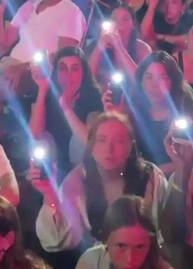 A large crowd of people is sitting and standing outdoors at what appears to be a concert or event. Most of them are holding up their cell phones with the flashlights on, creating a sea of light. The crowd is diverse, with people of various ages and backgrounds visible. Some people are sitting on the ground, while others are standing. The atmosphere appears to be somber as music plays in the background. There is a building with the text "Tel Aviv University" visible in the distance. The lighting is a mix of natural and artificial light from the phones.