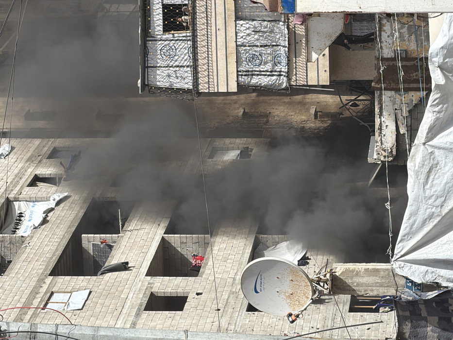 - "An urban scene in the city of Gaza, Palestinian Territory, depicts a multi-story building emitting a large, dense plume of dark grey smoke from a lower-mid level opening on its left facade" by FM-PSI0J3, licensed under CC BY 4.0