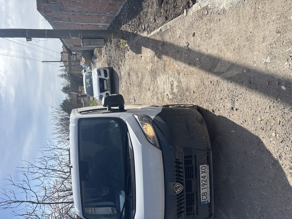The image depicts a narrow, unpaved dirt road in Obruchishte, Bulgaria, under bright daylight with strong shadows. In the foreground, a white Peugeot van (license plate CB 1924 XO, Bulgarian registration) is parked or stationary, facing away from the camera. Its front right amber turn signal is illuminated. Two indistinct human figures are visible inside the van through the windshield, occupying the driver and front passenger seats. Further down the road, a white Audi SUV (license plate CT 0663 MK, Bulgarian registration) is also stationary, facing the Peugeot van. The road surface is uneven, consisting of dirt and gravel. To the right of the road, a concrete curb transitions into a strip of unkempt ground alongside a low brick wall that appears unfinished or in disrepair. A utility pole with overhead wires runs parallel to this wall. In the mid-ground on the right, near the Audi, a pile of sand or gravel and a large, round hay bale are present. In the background, several older residential buildings with tiled roofs are visible, interspersed with bare deciduous trees, suggesting a winter or early spring season. The sky is partly cloudy.