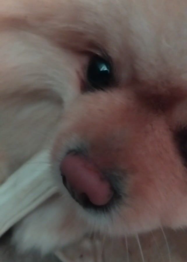 A close-up video shows the face of a small, light-colored dog, likely a Pomeranian, as someone pets its head