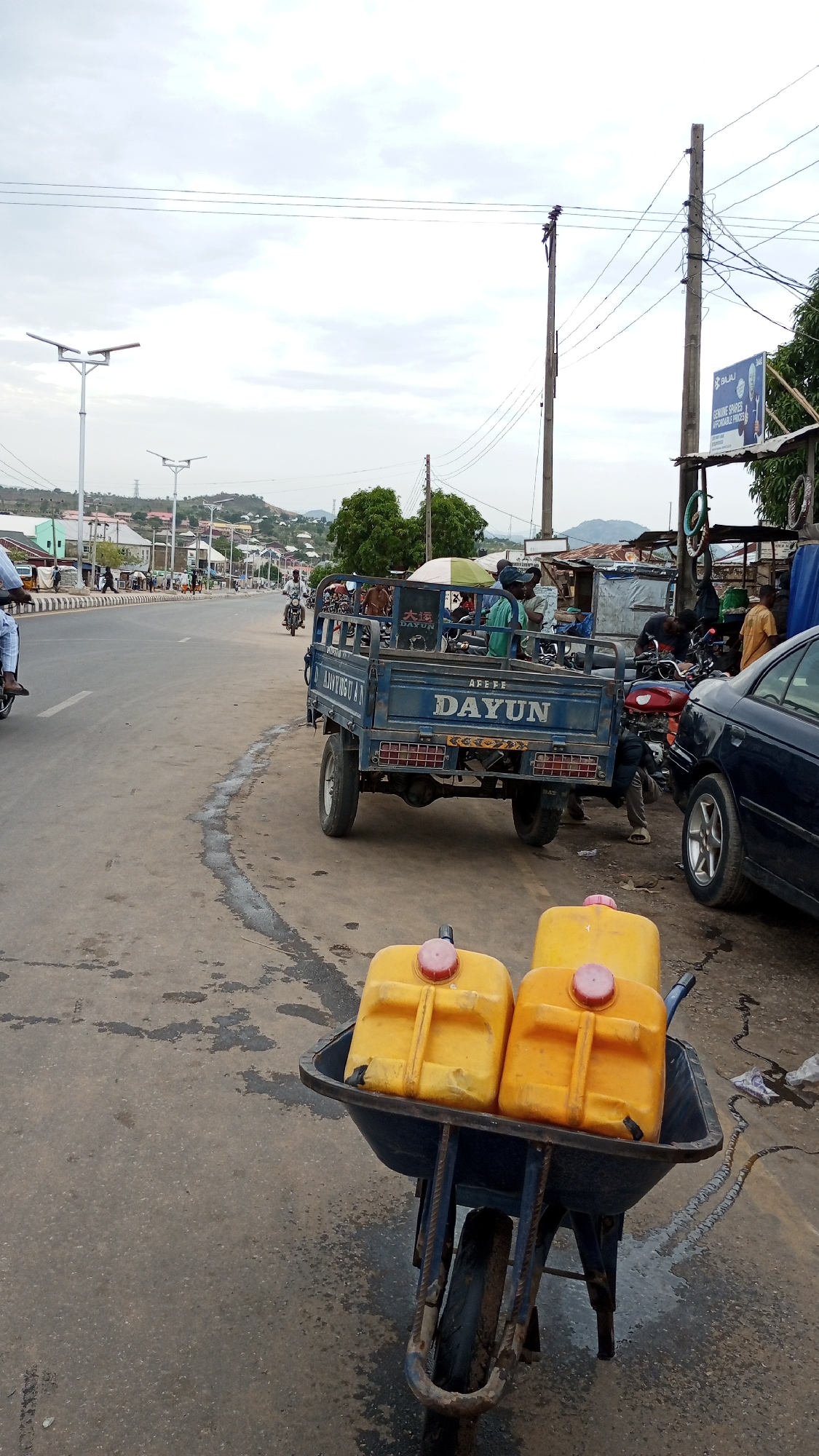 The scene is set in Zango-ndaji, Nigeria, depicting a street view on an overcast day. In the foreground, a dark blue wheelbarrow holds three yellow jerrycans with red caps. The wheelbarrow is positioned on a cracked concrete surface, possibly the edge of a sidewalk. Further back, a light blue three-wheeled vehicle with "DAYUN" emblazoned on the back is parked next to a dark-colored car. Several people are either riding in the back of the vehicle or standing around it. A motorcycle is also parked beside the vehicle. In the background, a road stretches into the distance, lined with buildings and other structures. Utility poles with wires are visible against the overcast sky. Other people can be seen walking along the road. A Bajaj billboard is visible on the right side.