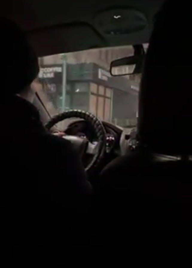 A person in a dark jacket and hat is driving a car at night. The view is from the backseat, focusing on the driver and the road ahead through the windshield. Street lights and building lights are visible through the windshield, as well as a "Coffee Bean" sign. The interior of the car is mostly dark. The driver's hands are on the steering wheel. The road appears wet, possibly from rain or snow.