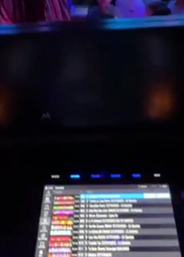 DJ booth overlooking a crowded dance floor. The DJ console is in the foreground, featuring a digital display and control knobs, with lights on the console. A screen displays a song list and audio waveforms. The camera pans up to reveal a nightclub scene with a large crowd of people dancing under colorful lights. The nightclub, which appears to be called "The Tango," is filled with people in casual attire, illuminated by neon lights overhead. The environment is energetic and upbeat.