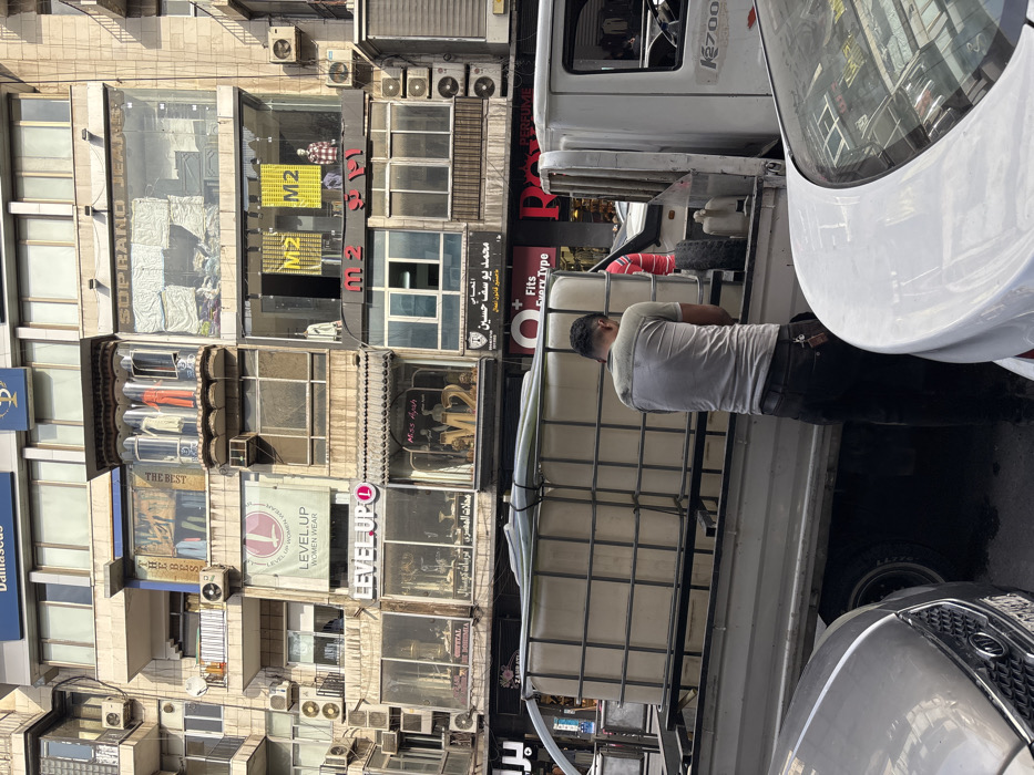 The image depicts an urban street scene in As-Salihiya Municipality, Syria, with a multi-story building dominating the background. A light-colored pickup truck, marked with "K2700", is positioned in the mid-ground, containing a large, white, cage-framed Intermediate Bulk Container (IBC) with white hosing coiled on top. A man wearing a light-colored t-shirt and dark trousers leans into the truck bed, interacting with the IBC or its connections. A second individual in a red shirt is partially visible deeper within the truck bed. The immediate foreground includes the front section of a silver sedan and the rear section of a white sedan. The background building's facade is densely covered with commercial storefronts, featuring large glass display windows and various signs, including "LEVEL UP WOMEN WEAR," "M2," and "SOPRANO JEANS." Mannequins are visible in several store windows and within an ornate, multi-paneled wooden bay window on an upper floor. Numerous external air conditioning units are mounted on the building's exterior.