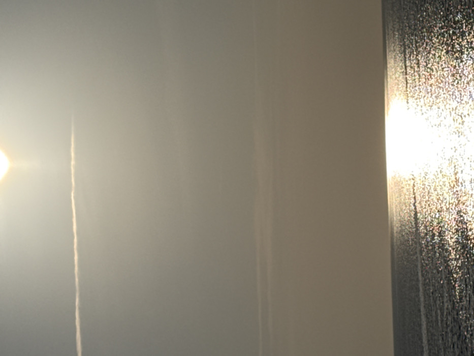The image presents an open seascape and sky, located in Palaiopoli, Greece. The bright, circular sun is centered in the upper third of the frame, casting a prominent, sparkling reflection across the water's surface from the horizon line towards the foreground. The water appears dark with numerous points of light from the sun's reflection. A distinct, thin, linear contrail is visible horizontally in the upper left quadrant of the sky. The sky itself is largely featureless and hazy, displaying a uniform light gray tone. The horizon line bisects the frame horizontally, separating the dark expanse of water from the luminous sky. No individuals, watercraft, or landmasses are observable.