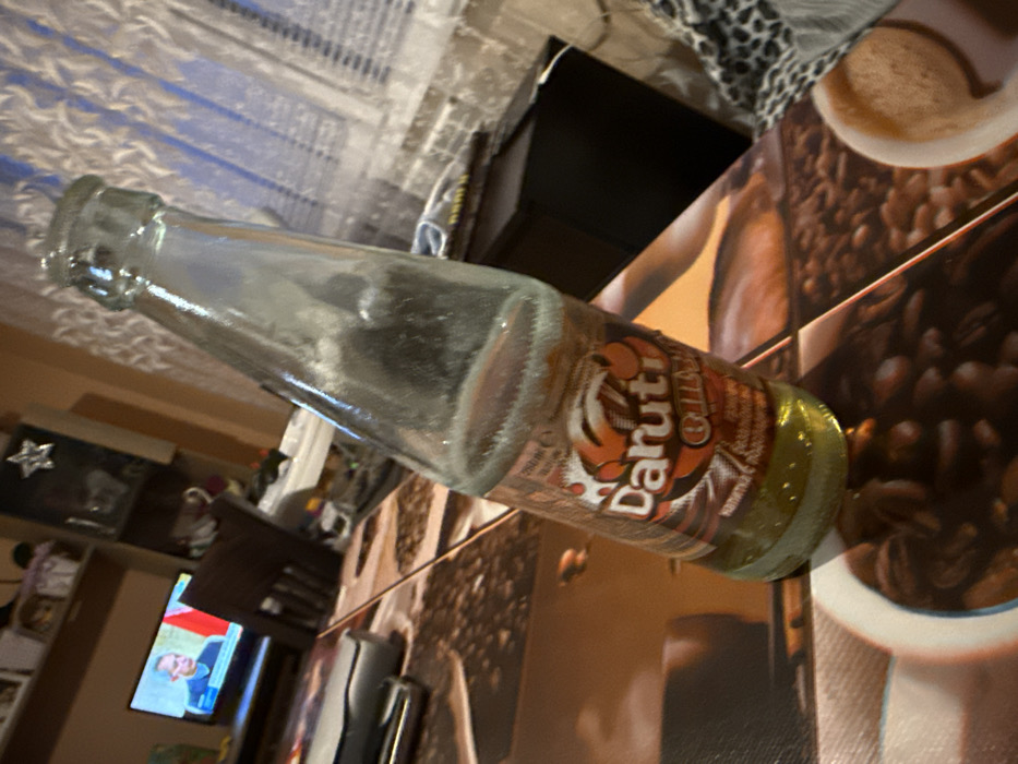 The image depicts an indoor domestic setting, likely a living or dining room in Sofia, Bulgaria. A clear glass bottle, approximately one-quarter full of a yellow-green liquid, stands upright on a table. The bottle features a label displaying "Daruti" in orange and white lettering, with further Bulgarian text including "КОПРИВА" (Nettle). The table surface is covered by a placemat or tablecloth patterned with coffee beans and cups. To the left on the table, a silver-colored object is partially visible. In the background, a television screen displays a male individual in a suit, positioned against a background featuring red and white elements. A dark wooden chair is situated at the table behind the bottle. Above the television, a shelving unit holds various items, including a white star-shaped ornament. To the right, a white, patterned curtain covers a window, with a dark, box-like object positioned beneath it. The scene is illuminated by artificial indoor lighting.