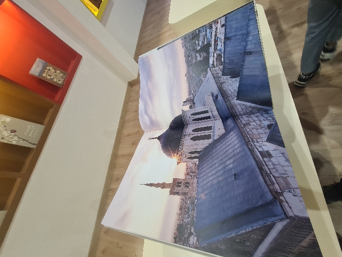 The image captures an indoor scene in the city of Shab'a, Syria, featuring a large, open display book positioned on a light-colored, flat surface