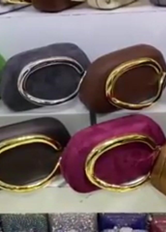 A person is recording a shelf full of purses. The top shelf has a row of purses in different colors, including silver, green, grey, brown, black, and red. The purses have a rounded rectangular shape and a crescent-shaped handle made of silver or gold. The second shelf has a similar row of purses in different colors like gold, brown, purple, bronze, and pink. The bottom shelf appears to have purses covered in gems.