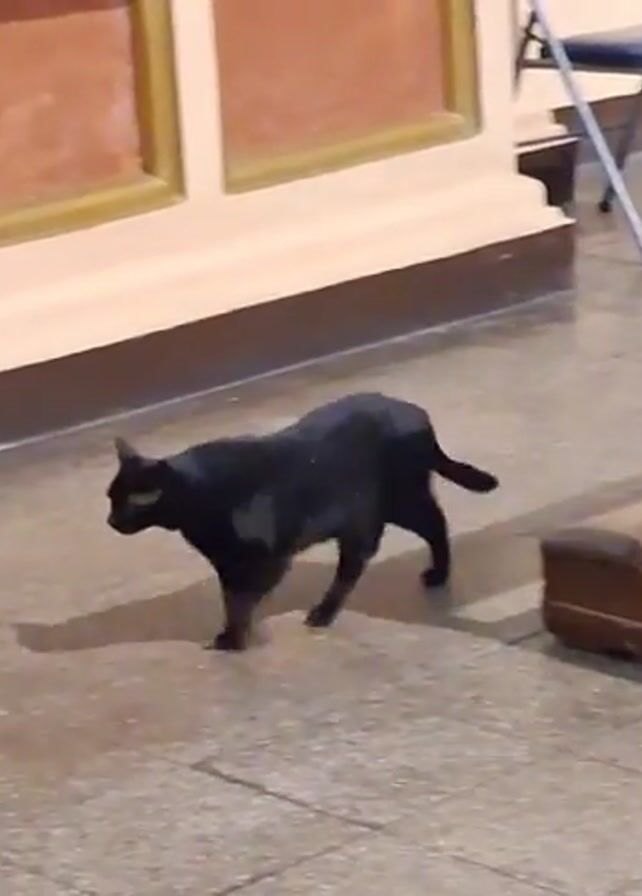 black cat walking across a tile floor in an indoor space. The room appears to be a church or similar religious building, with wooden pews along the sides. The walls are painted a light color, with darker brown and gold trim. There are no people visible in the video. The cat walks slowly and deliberately, appearing to explore the space.