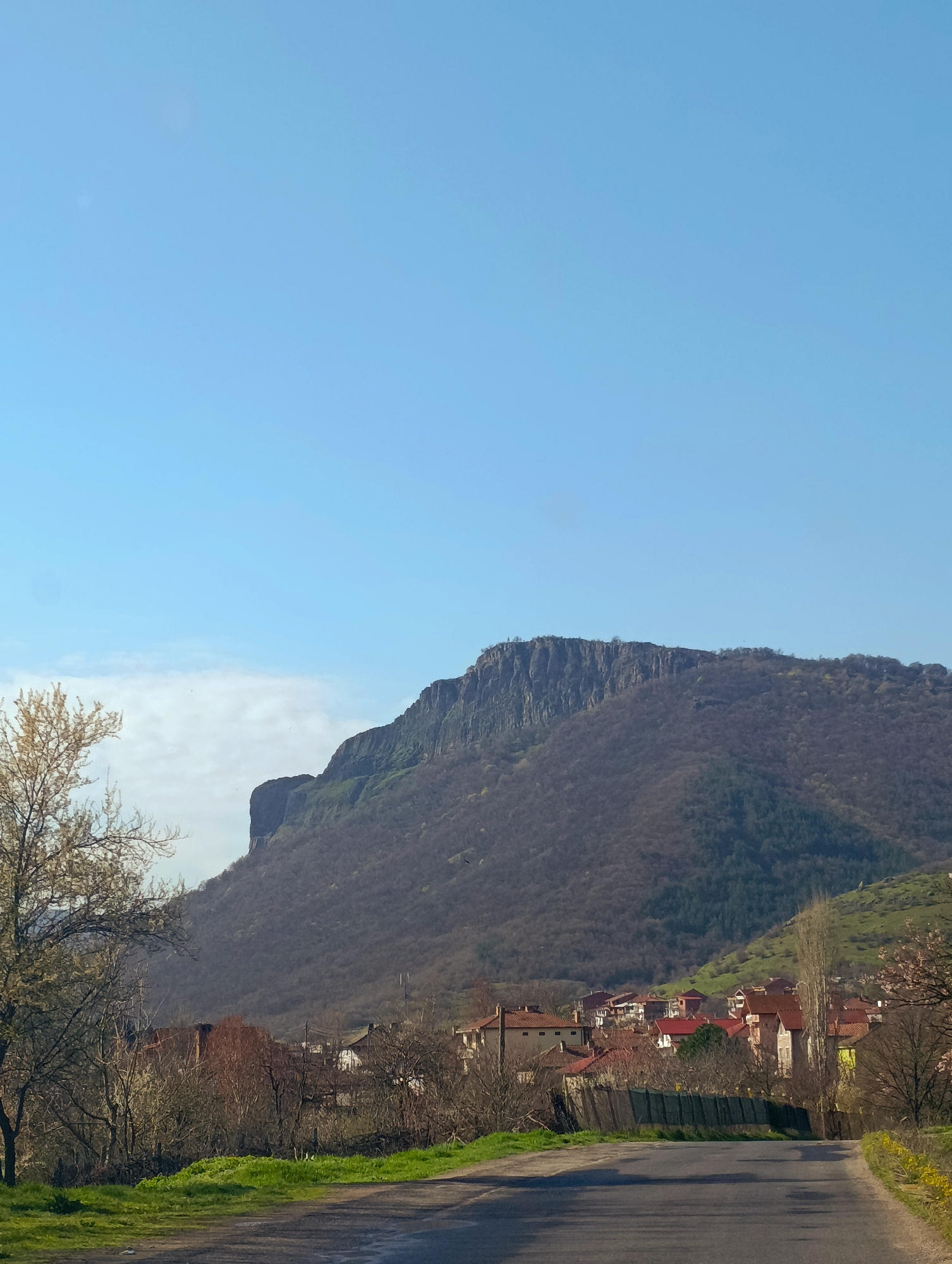 The image captures a view of a rural landscape near the city of Shiroko pole in Bulgaria. In the foreground, an asphalt road stretches towards the horizon. The middle ground features a small settlement with houses having red-tiled roofs, interspersed with bare trees and patches of green grass. Dominating the scene is a large, rocky mountain with sparse vegetation, rising steeply behind the village. The sky is a clear, pale blue with some light cloud cover near the mountain's base.