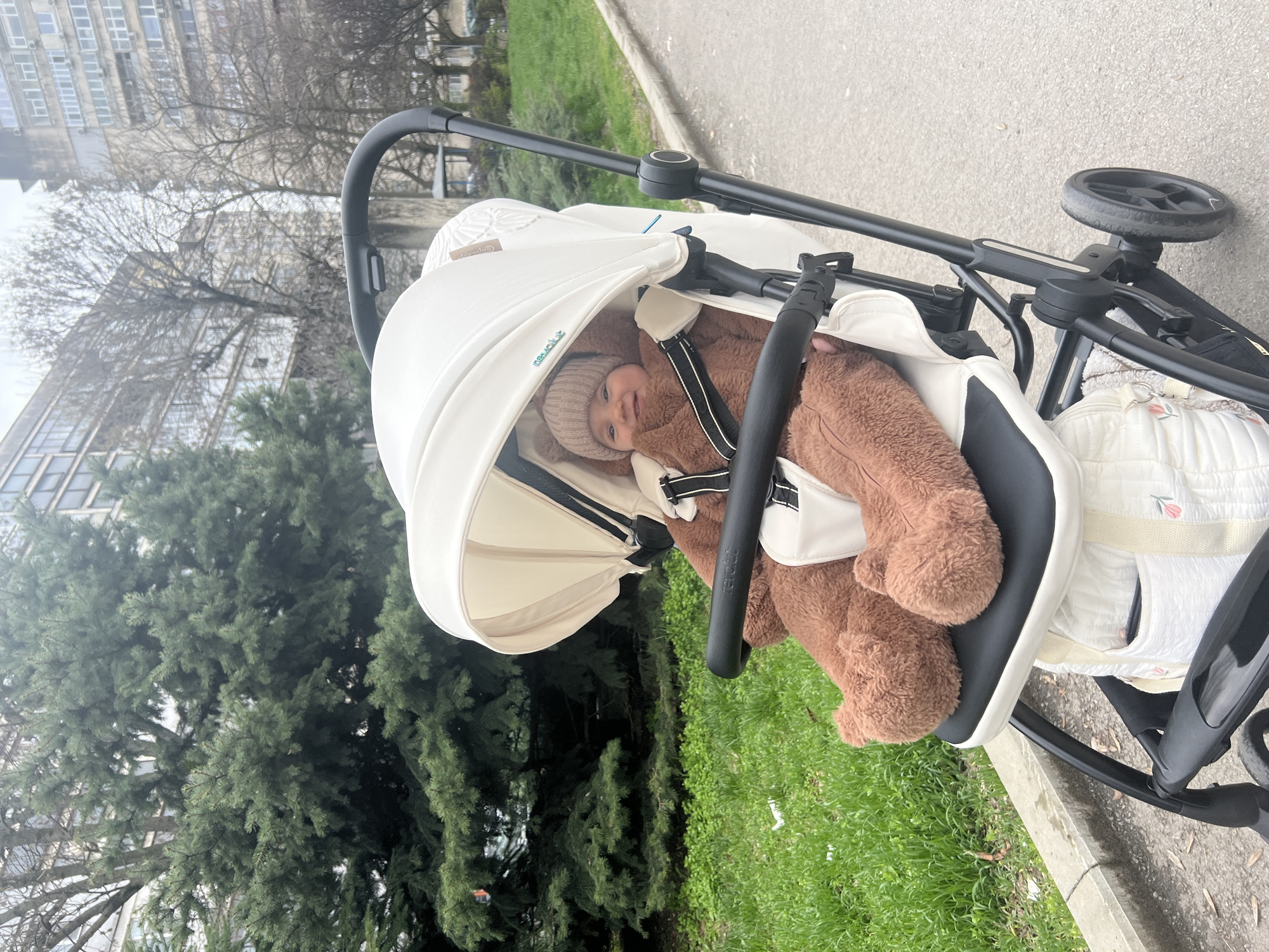 A baby in a brown, furry outfit and a light brown knitted hat is secured in a white stroller with a black frame. The stroller is on a sidewalk next to a patch of green grass. A large evergreen tree is to the left, and a tall building with many windows is visible in the background. The scene appears to be in an urban environment, likely in Ruse, Bulgaria, given the request. The stroller's canopy is partially extended, providing shade for the baby.