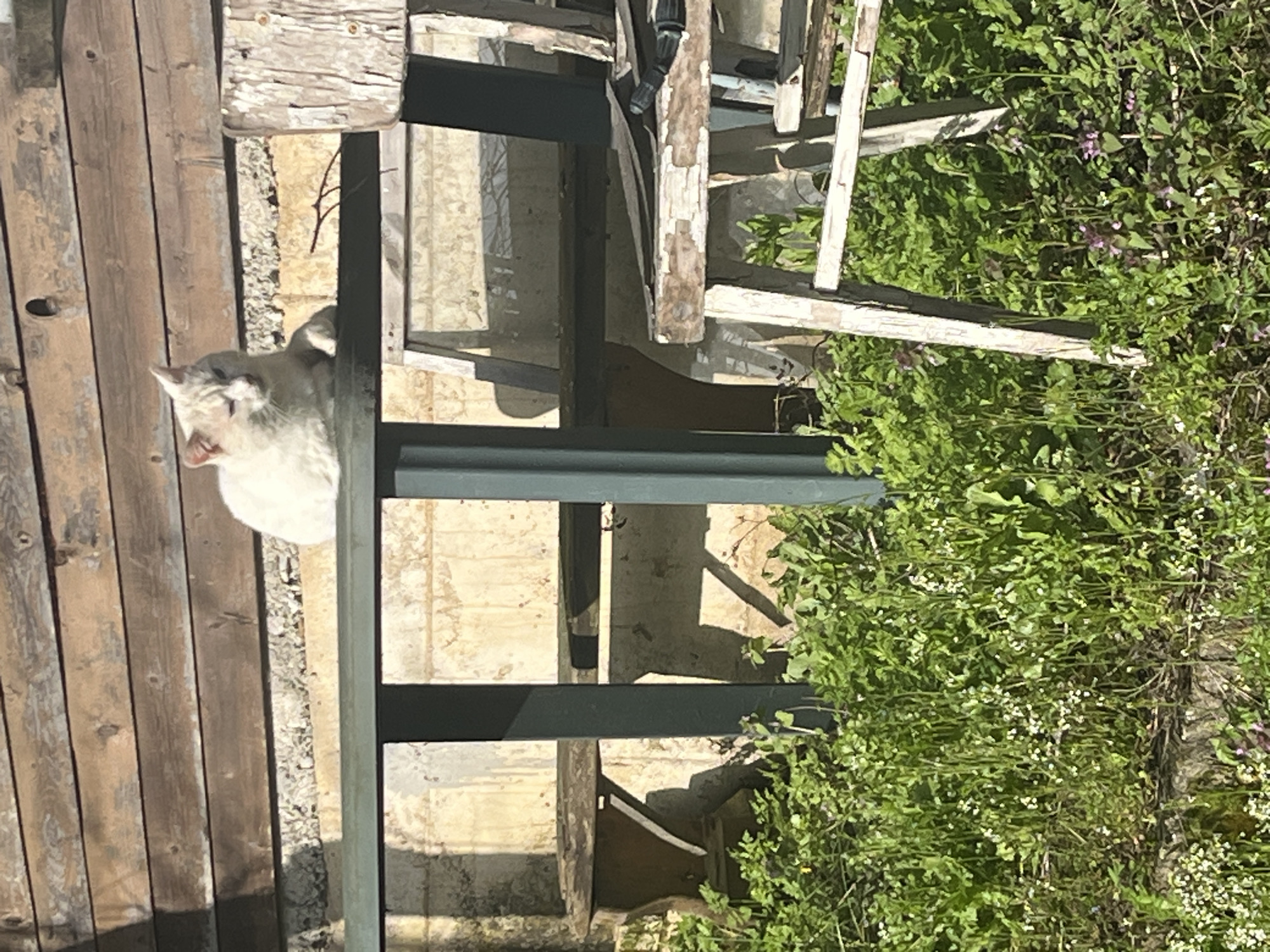 - "An outdoor scene features a pale cat beside a weathered wooden fence and an old, partly dismantled structure" by FM-09WuJ2, licensed under CC BY 4.0
