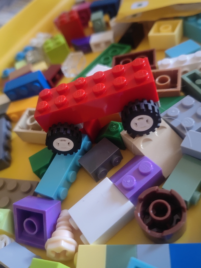 The image displays a cluttered collection of multi-colored plastic building blocks, resembling LEGO bricks, resting on a bright yellow surface. Dominating the mid-ground is a red 2x4 stud brick with two black wheels, each featuring a white hub, attached to its underside, suggesting a partially constructed vehicle. This red piece rests upon other blocks, including a teal-blue rectangular brick and a tan-colored brick. Surrounding the central red assembly are numerous other blocks of various sizes, shapes, and colors, including yellow, green, brown, white, purple, grey, dark grey, blue, and light green. Notable individual pieces include a purple square block, a tan screw-like piece, and a brown cylindrical piece. The background consists of additional, out-of-focus blocks scattered across the yellow surface. No individuals are present. The location is an indoor setting, Unknown, Unknown.