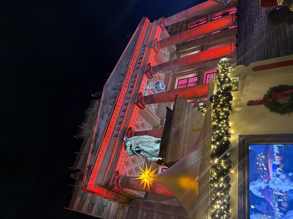 A tilted low-angle shot captures a building at night, adorned with festive decorations. "Konzerthaus Berlin" is emblazoned vertically along the facade, highlighted by red lights. A statue of a bear and a large star are prominent features. A garland of lights is visible on an adjacent wall, adding to the festive ambiance. The dark sky provides a stark backdrop.