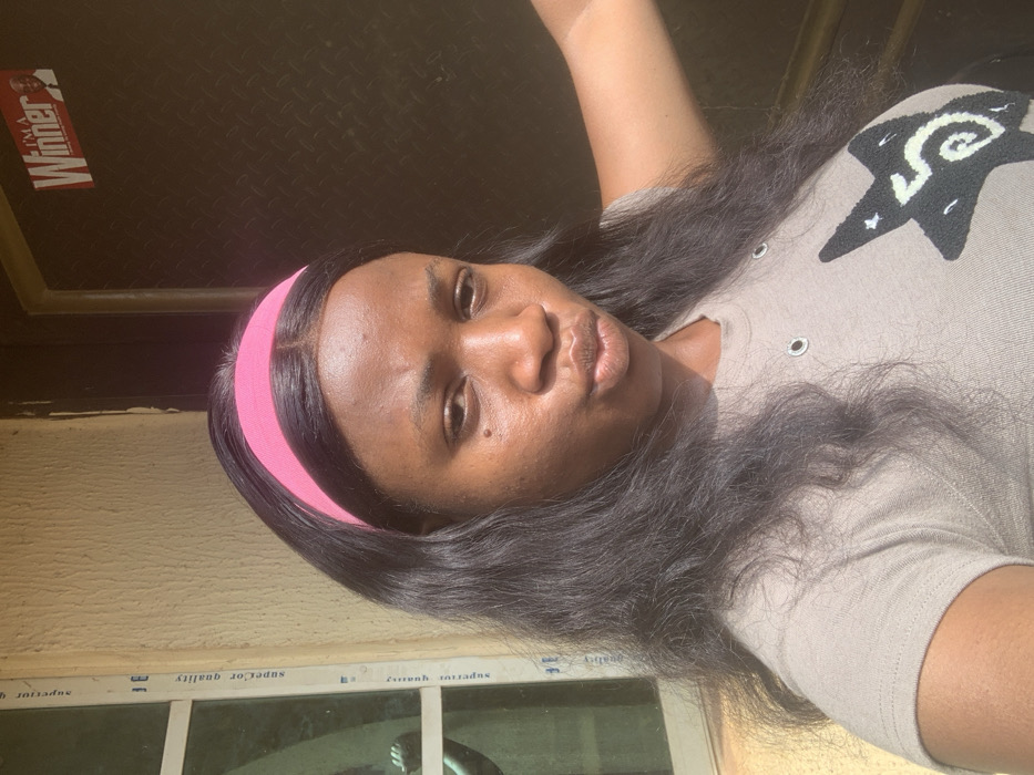 A young adult female with dark skin, long dark wavy hair, and a pink headband is depicted posing with pursed lips
