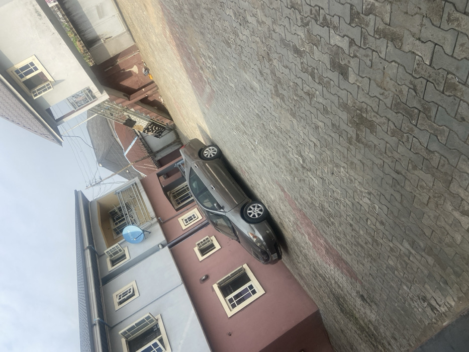 The scene depicts a residential courtyard in Yenegoa, Nigeria, under an overcast sky. A two-story building occupies the left side of the frame, featuring a reddish-brown lower facade and a light blue upper section. Both levels have multiple rectangular windows with white frames, several of which are open. A blue satellite dish is affixed to the upper level of this building, above a balcony with a metal railing. The building's roof is dark grey. A brown four-door sedan, identified as a Toyota Camry (circa 2002-2006 model), is parked diagonally on the gray and reddish interlocking paver driveway in the foreground, facing towards the left. The pavers exhibit variations in color and some surface discoloration. To the right, a second, lighter gray two-story building with a dark roof and a smaller balcony is partially visible. In the background, behind the second building, additional structures with rust-colored corrugated metal roofs and sections of barbed wire or razor wire fencing are discernible. Utility lines are present across the upper mid-ground. No individuals, animals, or discernible activities are present within the visible area.