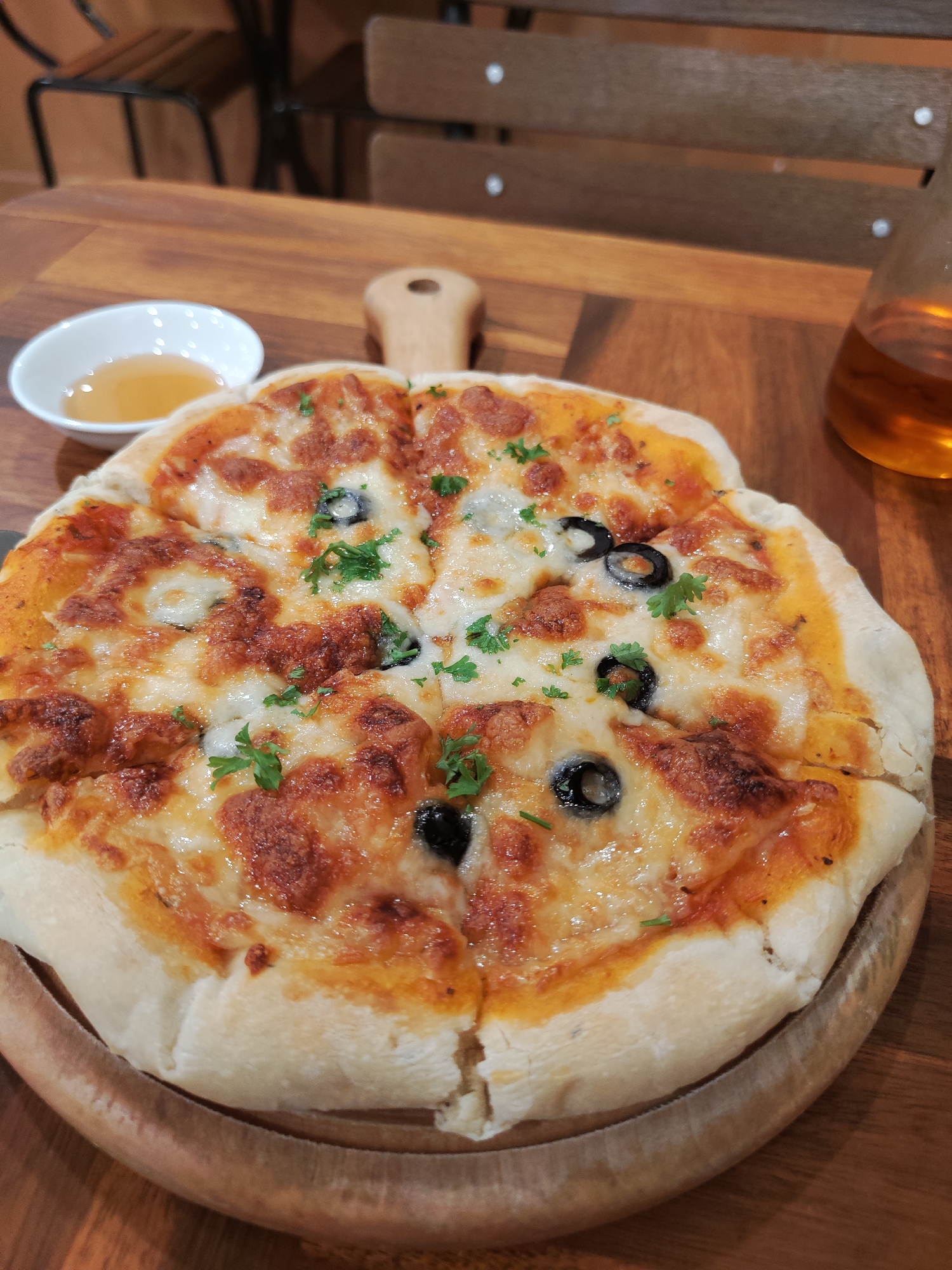 small pizza served on a wooden board, cut into segments and topped with cheese, tomato sauce, olives, and green herbs, likely parsley. A small bowl containing a yellow liquid is to the left of the pizza. A glass container with a similar yellow liquid is on the right side. The scene is set on a wooden table with chairs visible in the background. Based on research, this image appears to be from a restaurant in Da Lat, Vietnam.