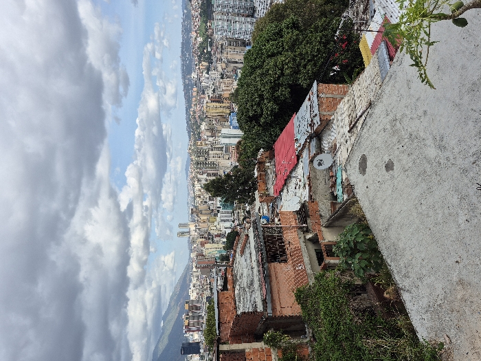 - "A high-angle view presents a stark contrast between a sprawling city beneath a cloudy sky and a shanty town foreground" by FM-I4ANH3, licensed under CC BY 4.0