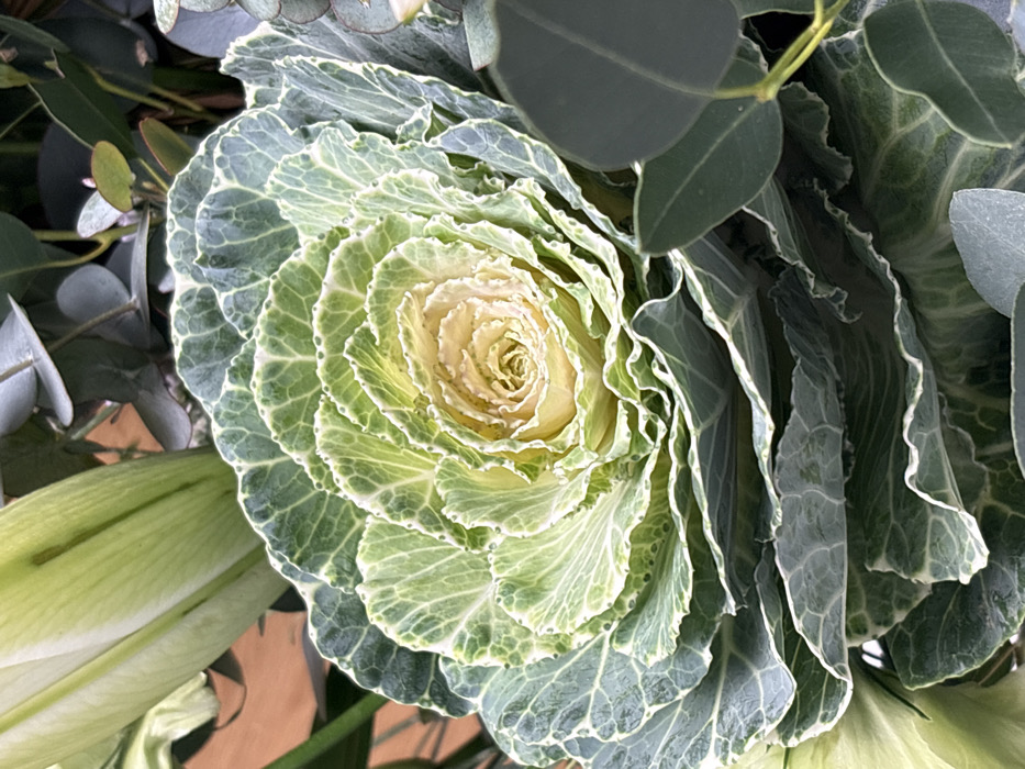 The image displays a detailed, close-up view of a floral arrangement. The specific location in Tel-Aviv, Israel, cannot be determined from the visual information provided. The central subject is an ornamental kale (Brassica oleracea), characterized by its tightly packed, ruffled leaves forming a circular rosette. The outer leaves are dark green with prominent light green to white variegated edges, while the inner leaves progressively transition to a lighter green and then a creamy yellow hue at the core. Small water droplets are visible on some of the green leaves. In the upper left portion of the frame, a segment of an unopened, light green lily bud with vertical striations is present. To the right and upper right, several rounded, bluish-green eucalyptus leaves are interspersed, some appearing slightly out of focus. No human figures, specific objects other than the plants, or discernible actions are depicted. The background is dark and indistinct, focusing attention solely on the plant arrangement.