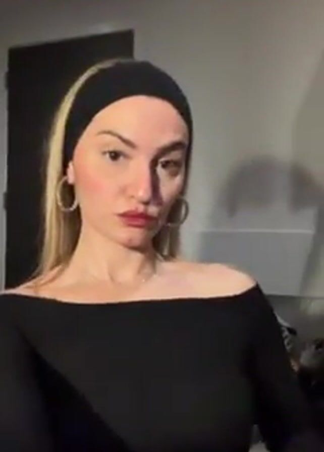 woman standing in front of the camera, wearing a black off-the-shoulder top, a black headband, and large hoop earrings. She has blonde hair, and she is wearing dark red lipstick. The background is a room, possibly a bedroom, with a door and some items visible on a shelf behind her. She looks at the camera and then briefly towards her left before the video ends. Music plays in the background.