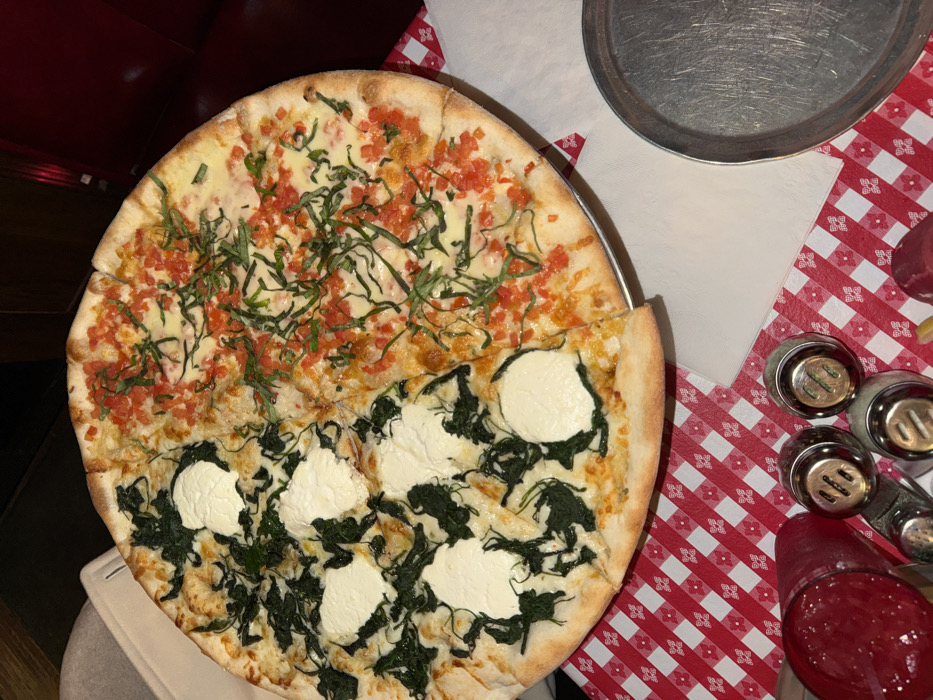 A partially consumed round pizza rests on a metallic serving tray. The pizza features two distinct halves. One half is topped with diced tomatoes and basil. The other half features spinach and dollops of soft, white cheese. A red and white checkered tablecloth lies nearby, along with a small, empty metallic tray and a collection of shakers. The pizza is positioned slightly off-center on the tray.