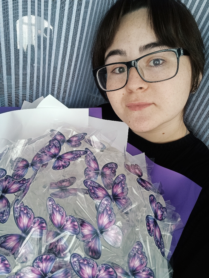 A young adult female is depicted from the chest up, positioned indoors. She has short dark hair, fair skin with freckles, and wears black-framed rectangular glasses. Her eyes are directed towards the camera, and her expression is neutral. She is wearing a black top. In front of her, she holds a large, elaborate arrangement. This arrangement consists of numerous artificial butterflies, predominantly purple and lavender with intricate patterns, each individually presented within clear cellophane or plastic wrapping. The entire cluster of butterflies is further wrapped in white and purple decorative paper or film. The background consists of a light-colored, vertically striped fabric, likely a curtain. The specific location within the city of Посад, Russia, is not discernible from visual evidence within the image.